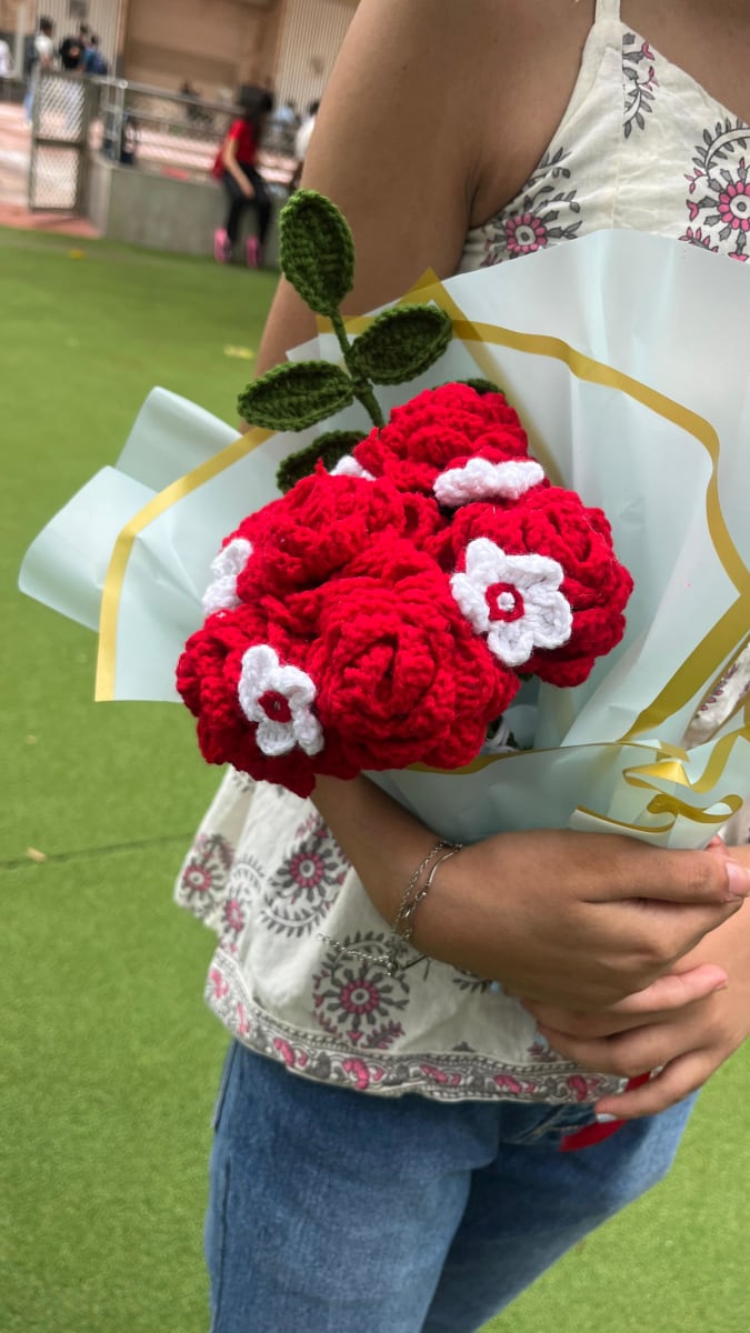 A charming bouquet of six handcrafted crochet roses, beautifully arranged with delicate leaf stems and tiny white buds nestled in between. Each bloom is carefully stitched, creating a timeless piece that radiates elegance, warmth, and love. Perfect as a gift or a forever keepsake ๐๐ฟ